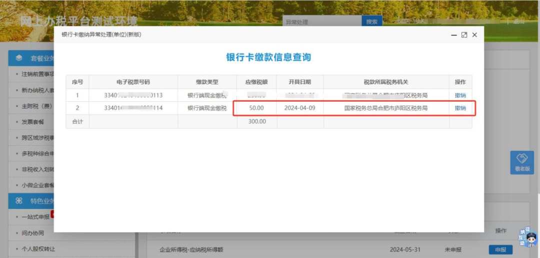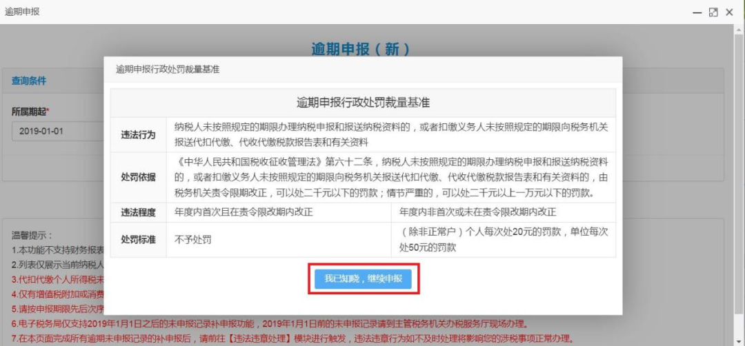 违法违章处理(逾期申报类) 模块操作指引 (一)纳税人(登记状态为正常)登录国家税务总局安徽省电子税务局网站,选择“企业业务”身份进入系统。 (二)在“我要办税”栏目点击法律追责与行政救济事项/违法处置/违法违章处理(逾期申报类)模块或通过上方搜索栏搜索关键词找到该模块。 新电子税务局试点纳税人登录后需点击地方特色/纳税申报/违法违章处理(逾期申报类)进入处理界面。 (三)如存在逾期未申报情形,根据页面提示先办理逾期申报。如不存在前述情形,请直接从第5步开始操作。按照下方图片的顺序,依次点击红框内的按钮完成逾期申报。 (四)申报完毕后,请点击违法违章处理(逾期申报类)按钮进入处罚页面。个人所得税的相关未申报记录,请登录自然人电子税务局进行申报,由于系统间数据同步需要时间,建议申报成功后24小时后,再查看申报状态,进行违法违章处理。 (五)点击“查询”按钮,显示待处理的违法行为,点击左侧红色处理按钮逐条按顺序处理。(第一条违法行为处理完毕才可以处理第二条) (六)阅读并确认责令限期改正通知书。点击“继续处理”,系统将自动判断是否符合首违不罚,如符合,进入首违不罚流程。 浏览拟处罚告知页面并进行陈述申辩,无异议则点击“我(单位)无异议”/“我已阅读,继续提交”按钮。(如果陈述申辩选择有异议,则会提示去主管税务机关处理)。 阅读首违不罚承诺书,点击“我已阅读并确认”按钮,弹出信息对话框,点击“确定”。 系统自动制发不予处罚决定书和首违不罚承诺书,并弹窗告知互联网救济渠道。点击“确定”后,处罚流程结束。 (七)如系统判断不符合首违不罚,则进入简易处罚流程。浏览简易处罚拟处罚告知页面并进行陈述申辩,无异议则点击“我(单位)无异议”/“我已阅读,继续提交”按钮(如果陈述申辩选择有异议,则会提示去主管税务机关处理),再点击“确定”按钮,系统自动生成处罚文书。 (八)提交成功后点击“去缴款”按钮,勾选需要缴纳罚款的项目(一次只能勾选一条未缴款信息),选择适合的方式进行缴款。其中网银缴款模式提供银行卡和扫码支付两种缴款方式。缴款成功后,点击“是”,处罚流程结束。 操作注意事项 注意事项一 进入违法违章处理(逾期申报类)模块发现有终结字样的违法行为时,需点击终结按钮按照下图的顺序依次操作,直至处理完毕该行为,此时方可处理下一条违法行为。 注意事项二 使用网银缴款时,网页自动拦截功能会阻止网银、网银控件安装页面弹窗导致缴款中断,请关闭网页拦截功能。 如发生中断,可通过电子税务局右上方搜索栏搜索“异常处理”,找到下图红框内对应的模块进行取消操作。 如是从新电子税务局地方特色模块进入违法违章处理模块的,请点击“首页”回到首页界面,在首页右上方蓝底色搜索栏搜索税费缴纳,依次点击进入税费缴纳/缴款凭证处理,勾选异常的款项点击“解锁”进行取消。 如已经进入网银缴款界面而中断的,需耐心等待10分钟左右方可进行取消操作,如仍不能取消,可致电主管税务机关进行后台取消。 取消后,再进入违法违章处理模块点击“罚款缴纳”可再次发起缴款。 注意事项三 待处理违法违章对应的所有未申报记录只涉及费、非税,不涉及税,则系统会直接终结该违法违章记录,页面提示不涉及处罚。 若对应的未申报记录(税)申报期限有对应的其他违法违章行为,且该行为进行了处罚或处于待缴罚款状态(已经生成处罚文书,尚未缴款),因一事不二罚,系统会直接终结该违法违章记录。 注意事项四 目前仅支持2019年1月1日之后的未申报记录补申报功能,之前的未申报记录需要到主管税务机关现场办理。如增值税主税种已经申报,附加和附加税未申报的无法单独进行网上补报。个别税种由于申报表单更新,无法网上补报,会提示需要线下申报,如2021年1月1日前的企业所得税、2022年1月1日前的房产税、城镇土地使用税、2022年7月1日前的印花税未申报记录请到主管税务机关办税服务厅现场办理。线上处罚适用范围同上述时间段。 注意事项五 系统操作可能存在延时,如提示“信息错误,无法办理!请检查逾期申报信息”,属于申报结果未同步,请耐心等待一段时间再尝试处理。又如一条违法行为出现操作完毕后仍显示待处理的,可以点击“查询”按钮刷新或者点击“处理”按钮再操作一遍,系统会自动检索是否已经处罚并进行过滤,不会生成多余的处罚决定书。